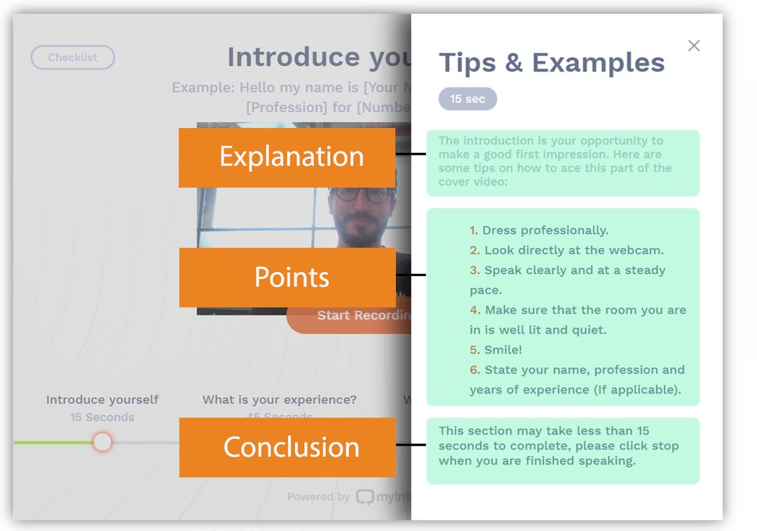Prior to the video recording process, we provide an option that enable to add a video introduction to your interview.